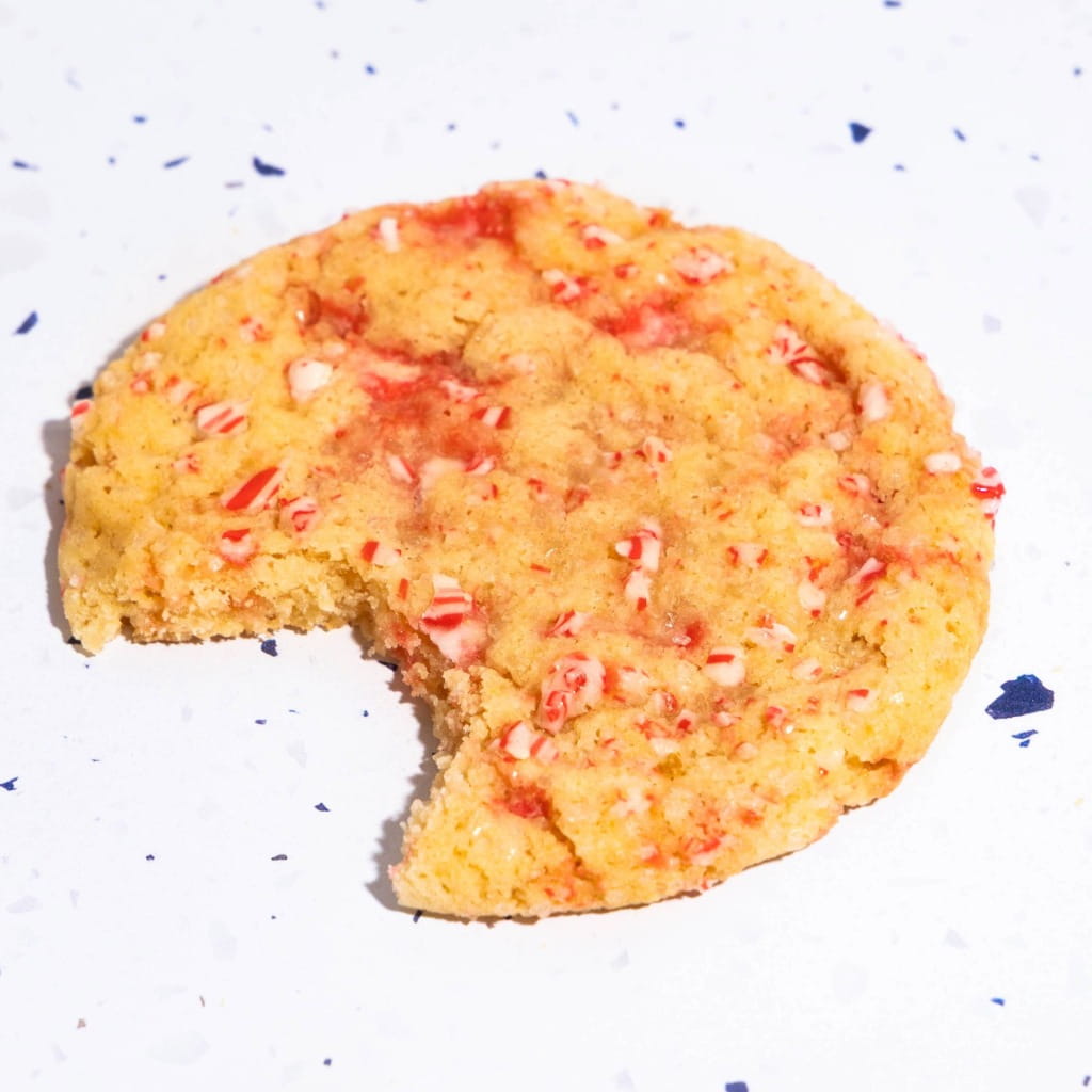 Butter, granulated sugar, brown sugar, eggs, vanilla, flour, baking soda, salt, cream of tartar, vital wheat gluten, crushed peppermint candy