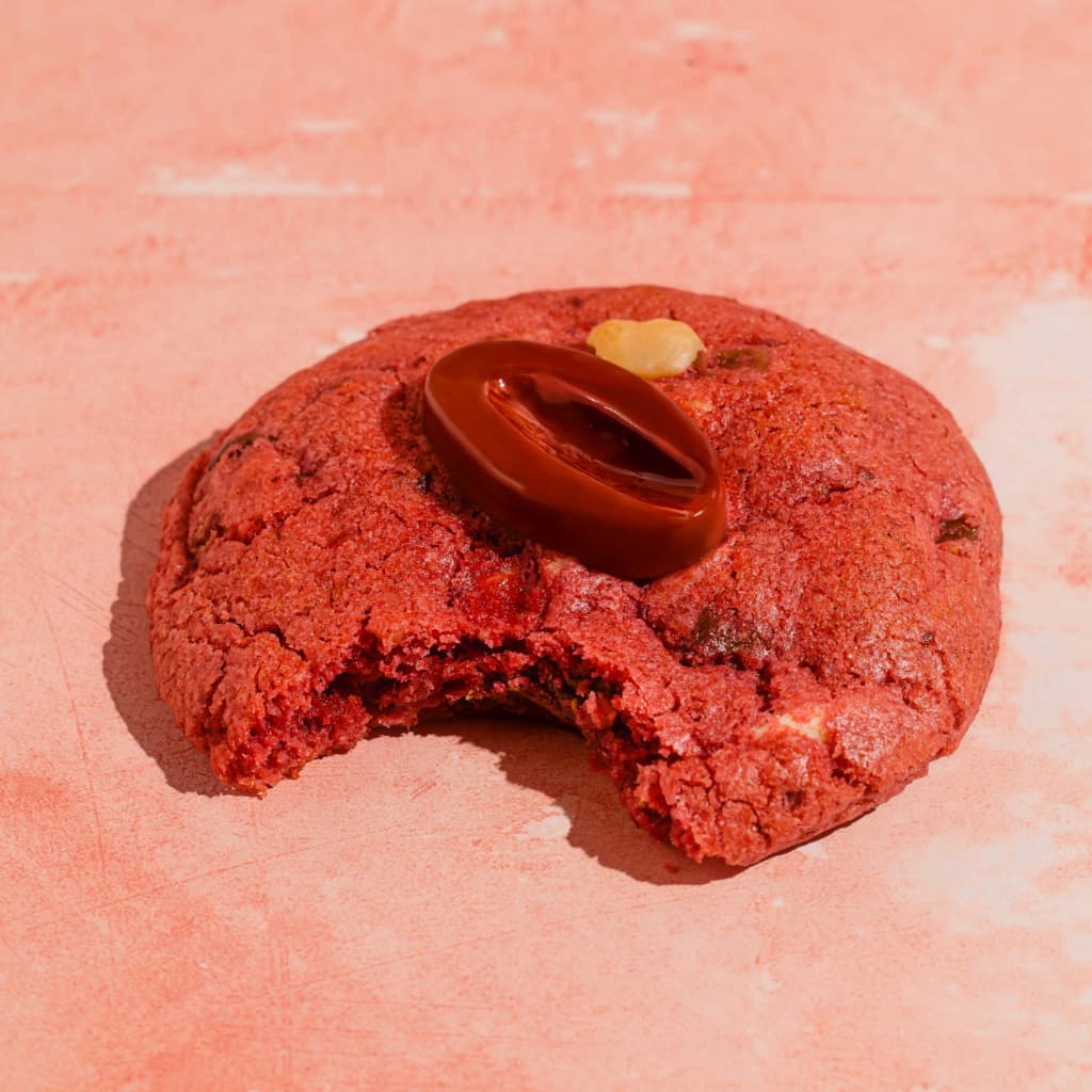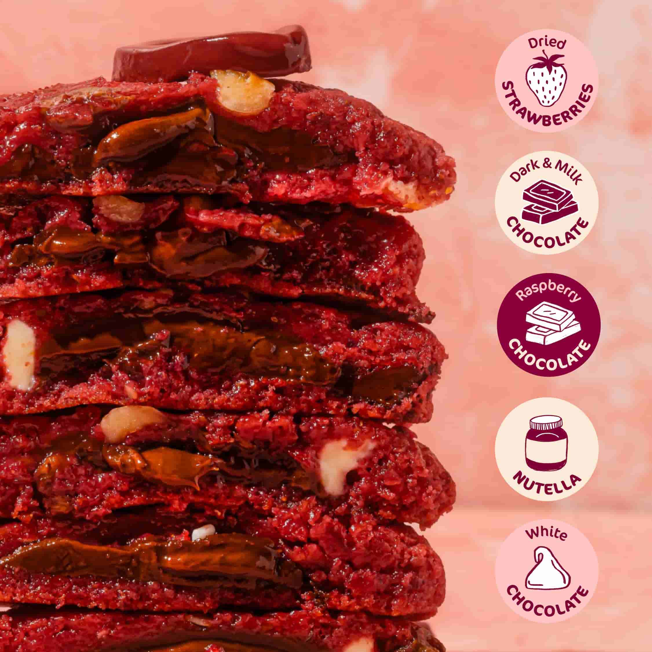 Strawberry flavored cookie dough with milk, dark, and white chocolate.