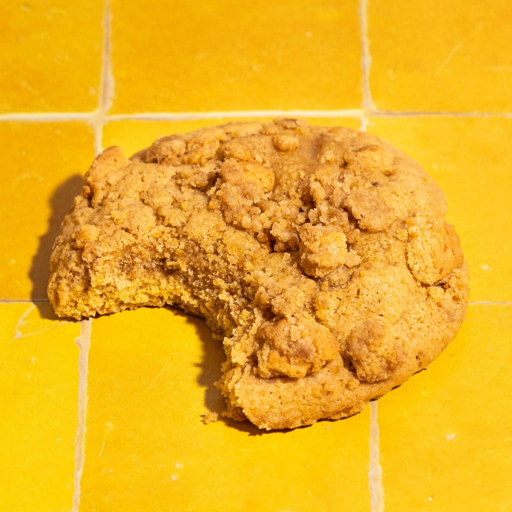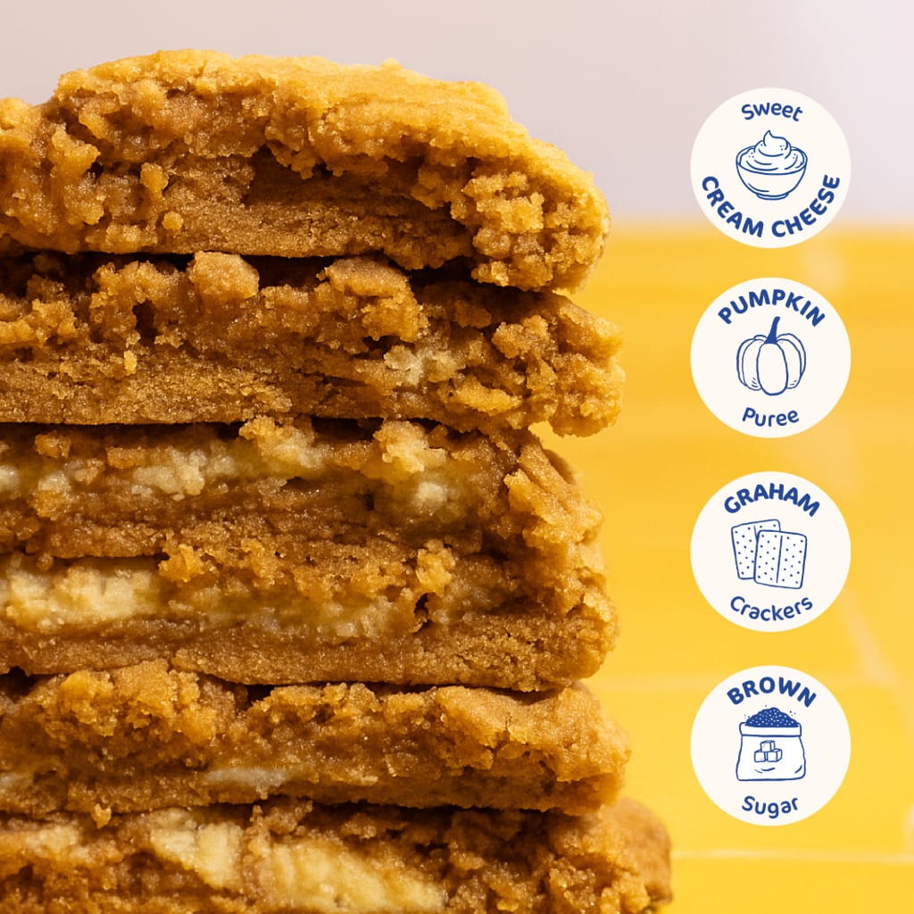 Cookie itself is based a pumpkin snickerdoodle recipe. It's stuffed with a sweet cream cheese filling, topped with a graham streusel, and baked on top of a graham cracker. All of these come together to be just like an individual serving of pumpkin cheesecake.